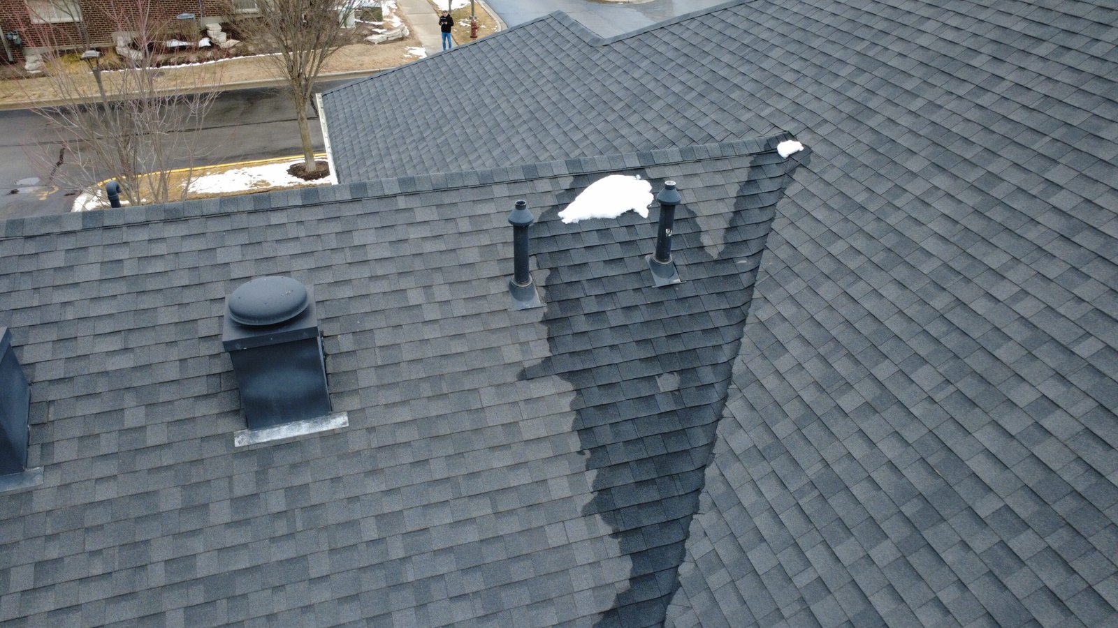 This project involved an aerial roof survey of a residential clubhouse in Deer Park, Illinois, conducted during winter conditions following a period of strong winds.